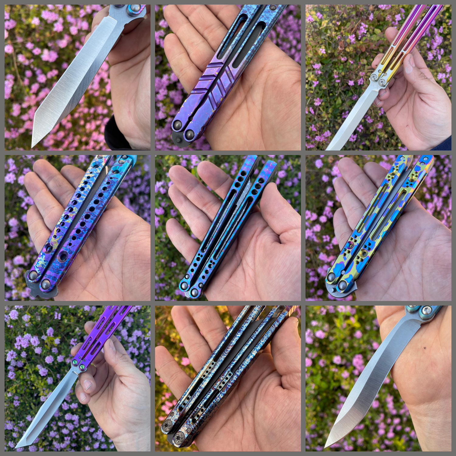 Introducing our premier balisong design with a sandwich handle setup, featuring top and bottom scales on hand-ground blades. Endless customization options available